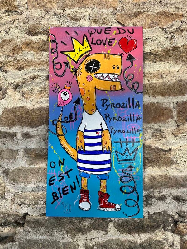 "Dinosaure rebelle, né des braises et de la poussière, il trace sa voie sur les murs du monde, laissant derrière lui l'empreinte ardente de sa créativité sauvage"
